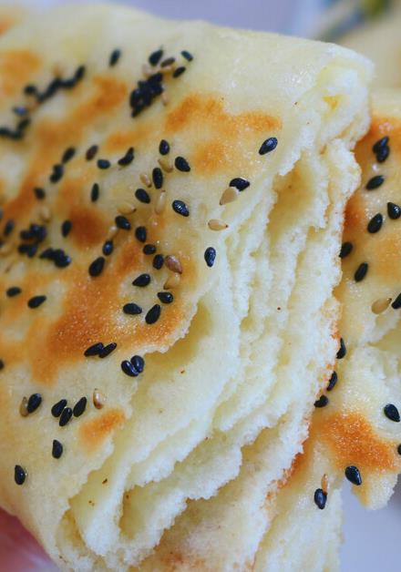 最后,将面饼像手风琴般从一侧折叠,用擀面杖擀压成大薄饼。确保厚度一致,以免烙制时不均匀。最后,撒上葱花,用蒸汽加热增香,再撒上炸香的黑芝麻。经过清洗后,就能享用美味的多层发面饼了!